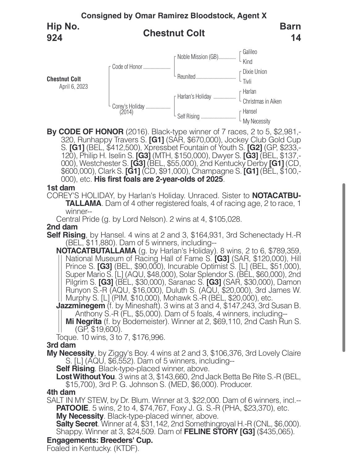 This colt by freshman Stallion Code of Honor is out of a Dam family loaded with Black-Type performers. Powerfully built he worked sharply in 10:2 at the 2025 Ocala Breeders Spring Sale. Mature for his age he will be training in Florida.